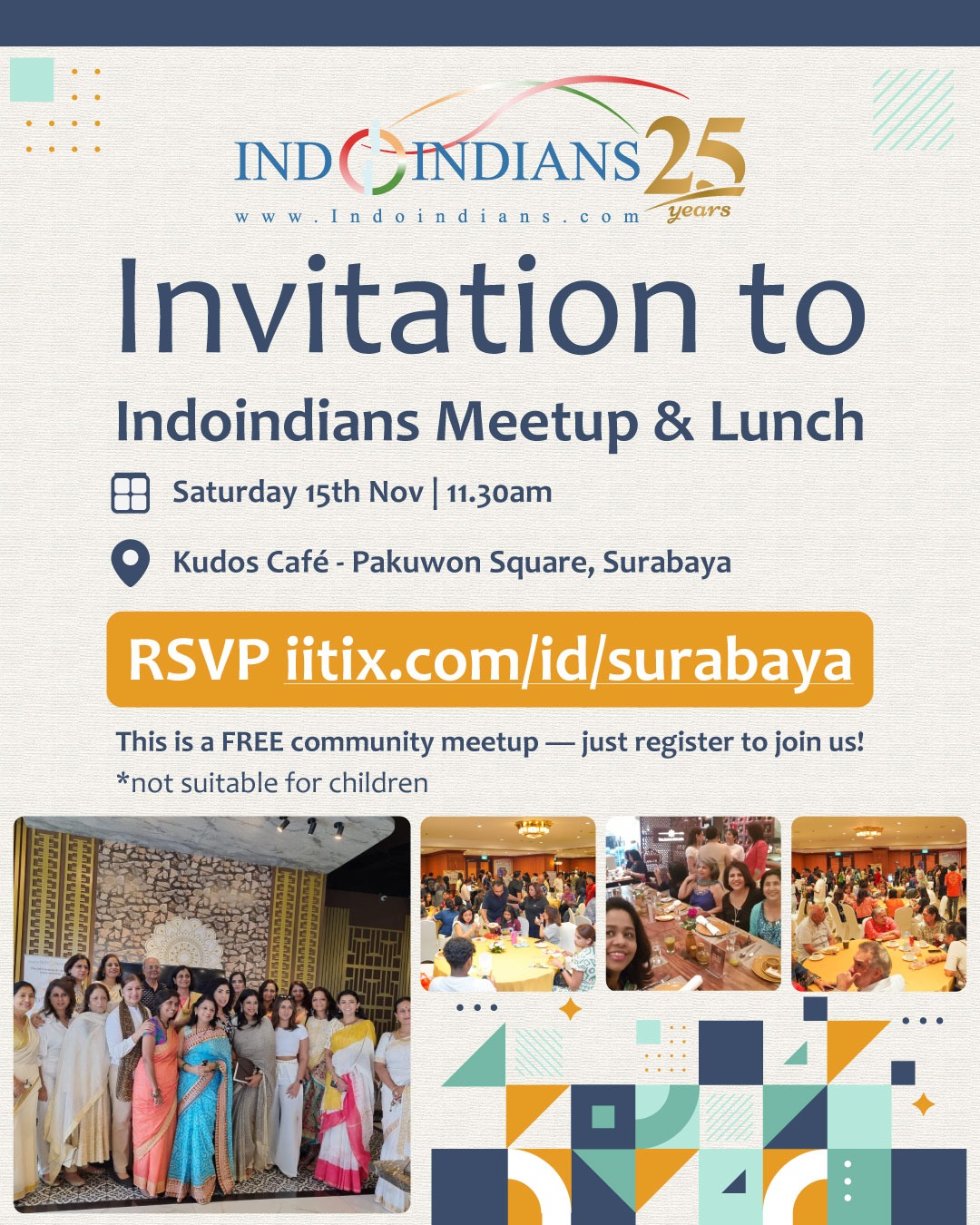 Featured EventsIndoIndians Meetup & Lunch in Surabaya🎨 IndoIndians Meetup & Lunch in Surabaya Dear Friends & Community Members, You are warmly invited to the first IndoIndians…15 Nov 2025Kudos Cafe, Pakuwon SquareBuy TicketsIndonesia Economic Forum & Indonesia India Business Forum Business Networking Event🌐 Business Networking Invitation Dear Professionals, Entrepreneurs & Business Leaders, You are warmly invited to join us for an exclusive…30 Nov 2025Aphrodite Bar & Resto, World Capital Tower, Mega KuninganBuy TicketsEarlyTIX Bird Ticket Indoindians Diwali Bazaar 2025Namaste Friends, Namaste Friends, Special Promo Till 2nd Oct 2025 only! Get 2 tickets for the price of 1 at just…5 Oct 2025The Borobudur Hotel JakartaBuy TicketsIndoIndians Meetup & Lunch in Surabaya🎨 IndoIndians Meetup & Lunch in Surabaya Dear Friends & Community Members, You are warmly invited to the first IndoIndians…15 Nov 2025Kudos Cafe, Pakuwon SquareBuy Tickets EarlyTIX Bird Ticket Indoindians Diwali Bazaar 2025Namaste Friends, Namaste Friends, Special Promo Till 2nd Oct 2025 only! Get 2 tickets for the price of 1 at just…5 Oct 2025The Borobudur Hotel JakartaBuy Tickets Browse Offers & EventsAll Events🎟 Upcoming🕰 Past Events🎬 Movies & Screenings📚 Learning & CoursesAll EventsIndonesia Economic Forum & Indonesia India Business Forum Business Networking Event🌐 Business Networking Invitation Dear Professionals, Entrepreneurs & Business Leaders, You are warmly invited to join us for an exclusive…30 Nov 2025Aphrodite Bar & Resto, World Capital Tower, Mega KuninganRp 300,000Buy TicketsIndoIndians Meetup & Lunch in Surabaya🎨 IndoIndians Meetup & Lunch in Surabaya Dear Friends & Community Members, You are warmly invited to the first IndoIndians…15 Nov 2025Kudos Cafe, Pakuwon Square(Free tickets)Buy TicketsEarlyTIX Bird Ticket Indoindians Diwali Bazaar 2025Namaste Friends, Namaste Friends, Special Promo Till 2nd Oct 2025 only! Get 2 tickets for the price of 1 at just…5 Oct 2025The Borobudur Hotel JakartaRp 2 /- (Buy 1 Get 1 Free)Buy Tickets🎟 UpcomingIndoIndians Meetup & Lunch in Surabaya🎨 IndoIndians Meetup & Lunch in Surabaya Dear Friends & Community Members, You are warmly invited to the first IndoIndians…15 Nov 2025Kudos Cafe, Pakuwon Square(Free tickets)Buy TicketsEarlyTIX Bird Ticket Indoindians Diwali Bazaar 2025Namaste Friends, Namaste Friends, Special Promo Till 2nd Oct 2025 only! Get 2 tickets for the price of 1 at just…5 Oct 2025The Borobudur Hotel JakartaRp 2 /- (Buy 1 Get 1 Free)Buy Tickets🕰 Past Events🎬 Movies & ScreeningsKuch Kuch Hota Hai Series Launches 2When Sunday 11 May from 2342342345.00pm 11 May 2026GMIS Auditorium Jl. HBR Motik No.1 Blok D6, Pademangan Tim., Kec. Pademangan, Jkt Utara, Daerah Khusus Ibukota Jakarta 14410Rp 100,000Buy Spot📚 Learning & Courses