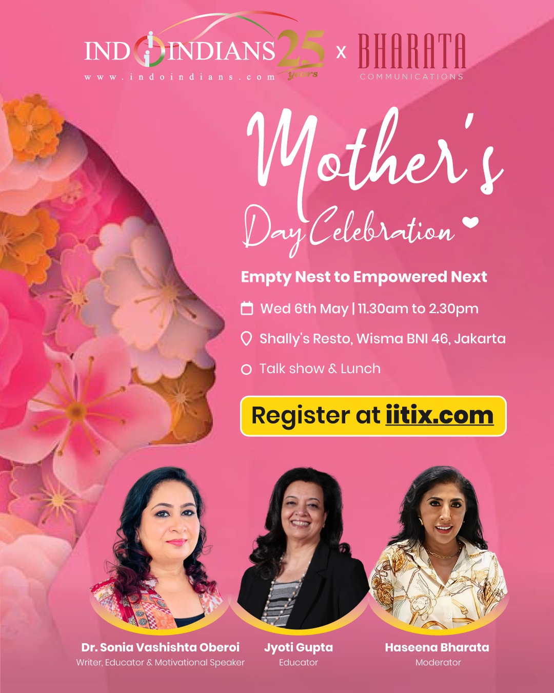 Featured EventsASEAN – India Bazaar 2026A Premium Marketplace. A Cultural Celebration. A Powerful Business Opportunity. Quality products for lifestyle, home, fashion, food and education. In…23 May 2026The Westin Hotel, Java Ballroom & Denpasar RoomEvent DetailIndoindians Self-Love & Mindfulness Afternoon🌸 Indoindians Self-Love & Mindfulness Afternoon Dear Friends & Community Members, You are warmly invited to join Indoindians Self-Love &…12 Feb 2026Broadway Lounge, Menara Rajawali, Mega KuninganEvent DetailBrowse Offers & Events🎟 Upcoming🕰 Past Events🎬 Movies & Screenings📚 Learning & CoursesAll Events🎟 UpcomingASEAN – India Bazaar 2026A Premium Marketplace. A Cultural Celebration. A Powerful Business Opportunity. Quality products for lifestyle, home, fashion, food and education. In…23 May 2026The Westin Hotel, Java Ballroom & Denpasar RoomStarting from Rp 1,500,000Event DetailASEAN-India Bazaar 2026 Early Bird TicketsSpecial Promo: BUY 1 GET 1 FREE! Where India meets ASEAN — and everyone feels at home. 🔊 ASEAN -…23 May 2026The Westin Hotel, Kuningan, JakartaRp 50,000 /- (Buy 1 Get 1 Free)Event DetailMother’s Day CelebrationMother’s Day Celebration: Empty Nest to Empowered Next A meaningful gathering to celebrate motherhood, connection, and a new chapter of…6 May 2026Shally's Resto, Wisma BNI 46 JakartaRp 220,000Event Detail🕰 Past EventsIndoindians Extraordinary Women Awards 2026🏆 Indoindians Extraordinary Women Awards 2026 In celebration of International Women’s Day, Indoindians proudly presents the Extraordinary Women Awards 2026—an…7 Mar 2026Wayang Auditorium, Embassy of India, GAMA Tower, Kuningan, Jakarta(Free Registration)RegisterIndoindians Self-Love & Mindfulness Afternoon🌸 Indoindians Self-Love & Mindfulness Afternoon Dear Friends & Community Members, You are warmly invited to join Indoindians Self-Love &…12 Feb 2026Broadway Lounge, Menara Rajawali, Mega KuninganRp 170,000Event DetailIndoIndians Meetup & Lunch in Surabaya🎨 IndoIndians Meetup & Lunch in Surabaya Dear Friends & Community Members, You are warmly invited to the first IndoIndians…15 Nov 2025Kudos Cafe, Pakuwon Square(Free tickets)Event DetailEarlyTIX Bird Ticket Indoindians Diwali Bazaar 2025Namaste Friends, Namaste Friends, Special Promo Till 2nd Oct 2025 only! Get 2 tickets for the price of 1 at just…5 Oct 2025The Borobudur Hotel JakartaRp 50,000 /- (Buy 1 Get 1 Free)Event Detail🎬 Movies & Screenings📚 Learning & CoursesAll EventsASEAN – India Bazaar 2026A Premium Marketplace. A Cultural Celebration. A Powerful Business Opportunity. Quality products for lifestyle, home, fashion, food and education. In…23 May 2026The Westin Hotel, Java Ballroom & Denpasar RoomStarting from Rp 1,500,000Event DetailASEAN-India Bazaar 2026 Early Bird TicketsSpecial Promo: BUY 1 GET 1 FREE! Where India meets ASEAN — and everyone feels at home. 🔊 ASEAN -…23 May 2026The Westin Hotel, Kuningan, JakartaRp 50,000 /- (Buy 1 Get 1 Free)Event DetailMother’s Day CelebrationMother’s Day Celebration: Empty Nest to Empowered Next A meaningful gathering to celebrate motherhood, connection, and a new chapter of…6 May 2026Shally's Resto, Wisma BNI 46 JakartaRp 220,000Event DetailIndoindians Extraordinary Women Awards 2026🏆 Indoindians Extraordinary Women Awards 2026 In celebration of International Women’s Day, Indoindians proudly presents the Extraordinary Women Awards 2026—an…7 Mar 2026Wayang Auditorium, Embassy of India, GAMA Tower, Kuningan, Jakarta(Free Registration)RegisterIndoindians Self-Love & Mindfulness Afternoon🌸 Indoindians Self-Love & Mindfulness Afternoon Dear Friends & Community Members, You are warmly invited to join Indoindians Self-Love &…12 Feb 2026Broadway Lounge, Menara Rajawali, Mega KuninganRp 170,000Event DetailIndonesia Economic Forum & Indonesia India Business Forum Business Networking Event🌐 Business Networking Invitation Dear Professionals, Entrepreneurs & Business Leaders, You are warmly invited to join us for an exclusive…30 Nov 2025Aphrodite Bar & Resto, World Capital Tower, Mega KuninganRp 300,000Event DetailExplore More