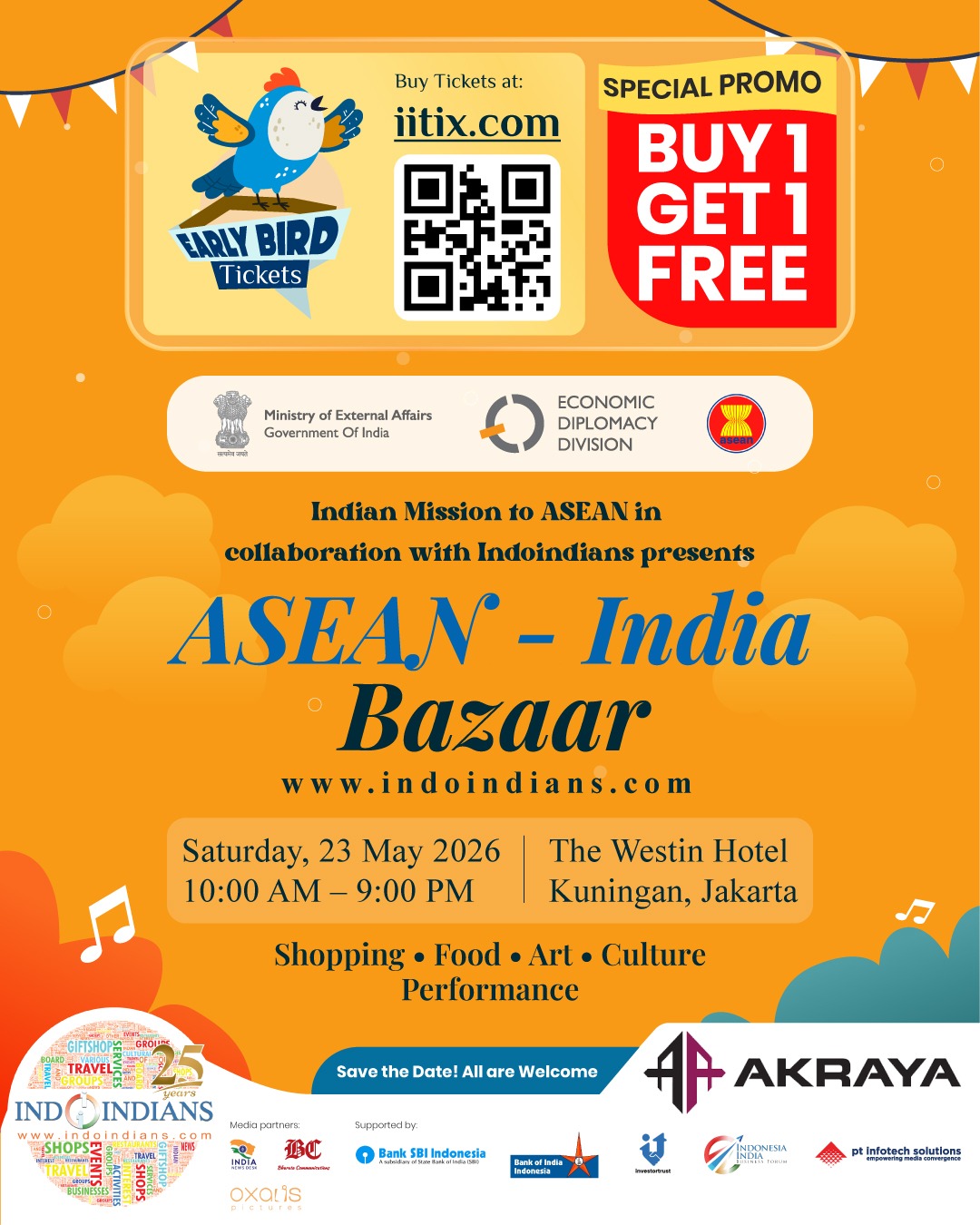 Featured EventsASEAN – India Bazaar 2026A Premium Marketplace. A Cultural Celebration. A Powerful Business Opportunity. Quality products for lifestyle, home, fashion, food and education. In…23 May 2026The Westin Hotel, Java Ballroom & Denpasar RoomEvent DetailIndoindians Self-Love & Mindfulness Afternoon🌸 Indoindians Self-Love & Mindfulness Afternoon Dear Friends & Community Members, You are warmly invited to join Indoindians Self-Love &…12 Feb 2026Broadway Lounge, Menara Rajawali, Mega KuninganEvent DetailBrowse Offers & Events🎟 Upcoming🕰 Past Events🎬 Movies & Screenings📚 Learning & CoursesAll Events🎟 UpcomingASEAN – India Bazaar 2026A Premium Marketplace. A Cultural Celebration. A Powerful Business Opportunity. Quality products for lifestyle, home, fashion, food and education. In…23 May 2026The Westin Hotel, Java Ballroom & Denpasar RoomStarting from Rp 1,500,000Event DetailASEAN-India Bazaar 2026 Early Bird TicketsSpecial Promo: BUY 1 GET 1 FREE! Where India meets ASEAN — and everyone feels at home. 🔊 ASEAN -…23 May 2026The Westin Hotel, Kuningan, JakartaRp 50,000 /- (Buy 1 Get 1 Free)Event DetailMother’ Day CelebrationMother’s Day Celebration: Empty Nest to Empowered Next A meaningful gathering to celebrate motherhood, connection, and a new chapter of…6 May 2026Shally's Resto, Wisma BNI 46 JakartaRp 220,000Event Detail🕰 Past EventsIndoindians Extraordinary Women Awards 2026🏆 Indoindians Extraordinary Women Awards 2026 In celebration of International Women’s Day, Indoindians proudly presents the Extraordinary Women Awards 2026—an…7 Mar 2026Wayang Auditorium, Embassy of India, GAMA Tower, Kuningan, Jakarta(Free Registration)RegisterIndoindians Self-Love & Mindfulness Afternoon🌸 Indoindians Self-Love & Mindfulness Afternoon Dear Friends & Community Members, You are warmly invited to join Indoindians Self-Love &…12 Feb 2026Broadway Lounge, Menara Rajawali, Mega KuninganRp 170,000Event DetailIndoIndians Meetup & Lunch in Surabaya🎨 IndoIndians Meetup & Lunch in Surabaya Dear Friends & Community Members, You are warmly invited to the first IndoIndians…15 Nov 2025Kudos Cafe, Pakuwon Square(Free tickets)Event DetailEarlyTIX Bird Ticket Indoindians Diwali Bazaar 2025Namaste Friends, Namaste Friends, Special Promo Till 2nd Oct 2025 only! Get 2 tickets for the price of 1 at just…5 Oct 2025The Borobudur Hotel JakartaRp 50,000 /- (Buy 1 Get 1 Free)Event Detail🎬 Movies & Screenings📚 Learning & CoursesAll EventsASEAN – India Bazaar 2026A Premium Marketplace. A Cultural Celebration. A Powerful Business Opportunity. Quality products for lifestyle, home, fashion, food and education. In…23 May 2026The Westin Hotel, Java Ballroom & Denpasar RoomStarting from Rp 1,500,000Event DetailASEAN-India Bazaar 2026 Early Bird TicketsSpecial Promo: BUY 1 GET 1 FREE! Where India meets ASEAN — and everyone feels at home. 🔊 ASEAN -…23 May 2026The Westin Hotel, Kuningan, JakartaRp 50,000 /- (Buy 1 Get 1 Free)Event DetailMother’ Day CelebrationMother’s Day Celebration: Empty Nest to Empowered Next A meaningful gathering to celebrate motherhood, connection, and a new chapter of…6 May 2026Shally's Resto, Wisma BNI 46 JakartaRp 220,000Event DetailIndoindians Extraordinary Women Awards 2026🏆 Indoindians Extraordinary Women Awards 2026 In celebration of International Women’s Day, Indoindians proudly presents the Extraordinary Women Awards 2026—an…7 Mar 2026Wayang Auditorium, Embassy of India, GAMA Tower, Kuningan, Jakarta(Free Registration)RegisterIndoindians Self-Love & Mindfulness Afternoon🌸 Indoindians Self-Love & Mindfulness Afternoon Dear Friends & Community Members, You are warmly invited to join Indoindians Self-Love &…12 Feb 2026Broadway Lounge, Menara Rajawali, Mega KuninganRp 170,000Event DetailIndonesia Economic Forum & Indonesia India Business Forum Business Networking Event🌐 Business Networking Invitation Dear Professionals, Entrepreneurs & Business Leaders, You are warmly invited to join us for an exclusive…30 Nov 2025Aphrodite Bar & Resto, World Capital Tower, Mega KuninganRp 300,000Event DetailExplore More