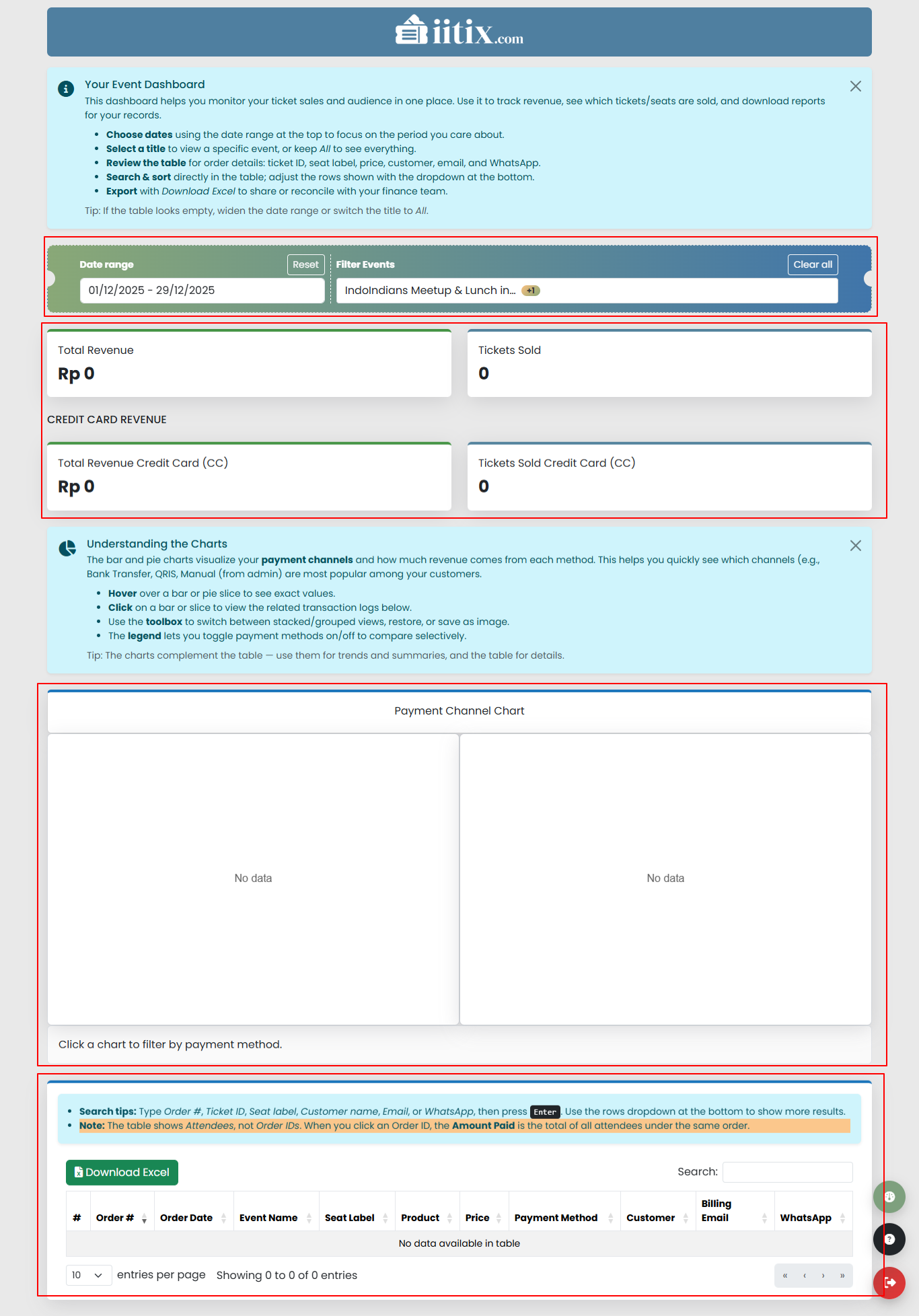 Bagian ini menampilkan ringkasan penjualan dan jumlah tiket, sesuai filter tanggal dan event yang dipilih.