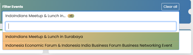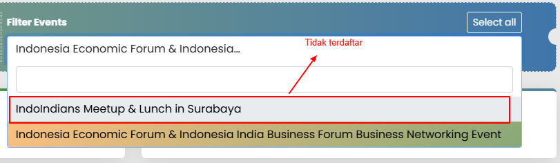 - Semua Event akan kembali ke kolom pencarian events. Saat kolom diklik, semua event tampil di dropdown.