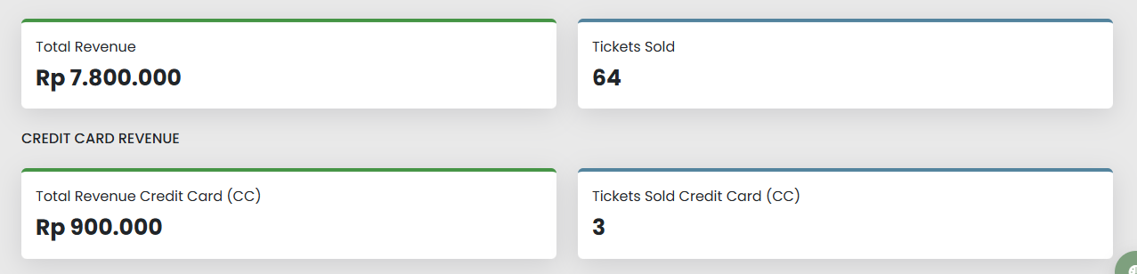 - Tickets Sold via CC: Menampilkan jumlah tiket yang dibayar menggunakan kartu kredit/debit.