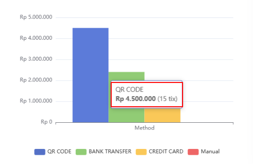 Anda juga bisa melihat jumlah tiket per metode pembayaran dengan mengarahkan kursor ke bar chart atau pie chart seperti pada gambar.