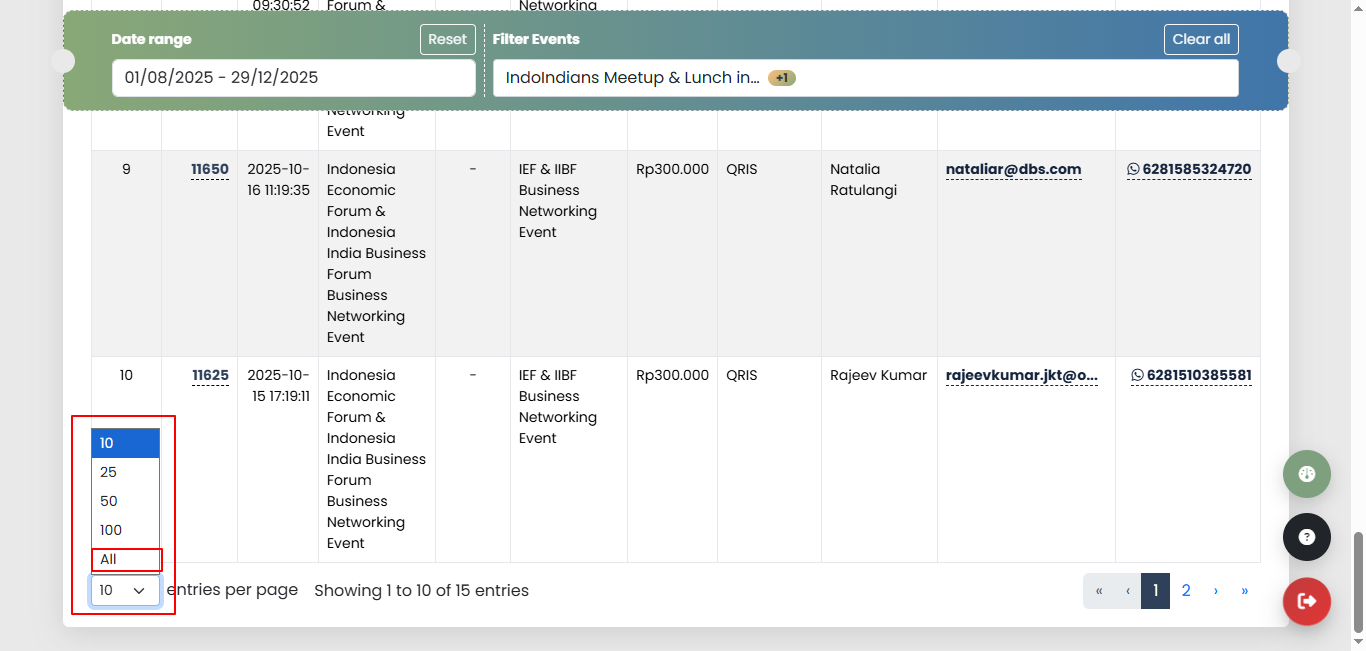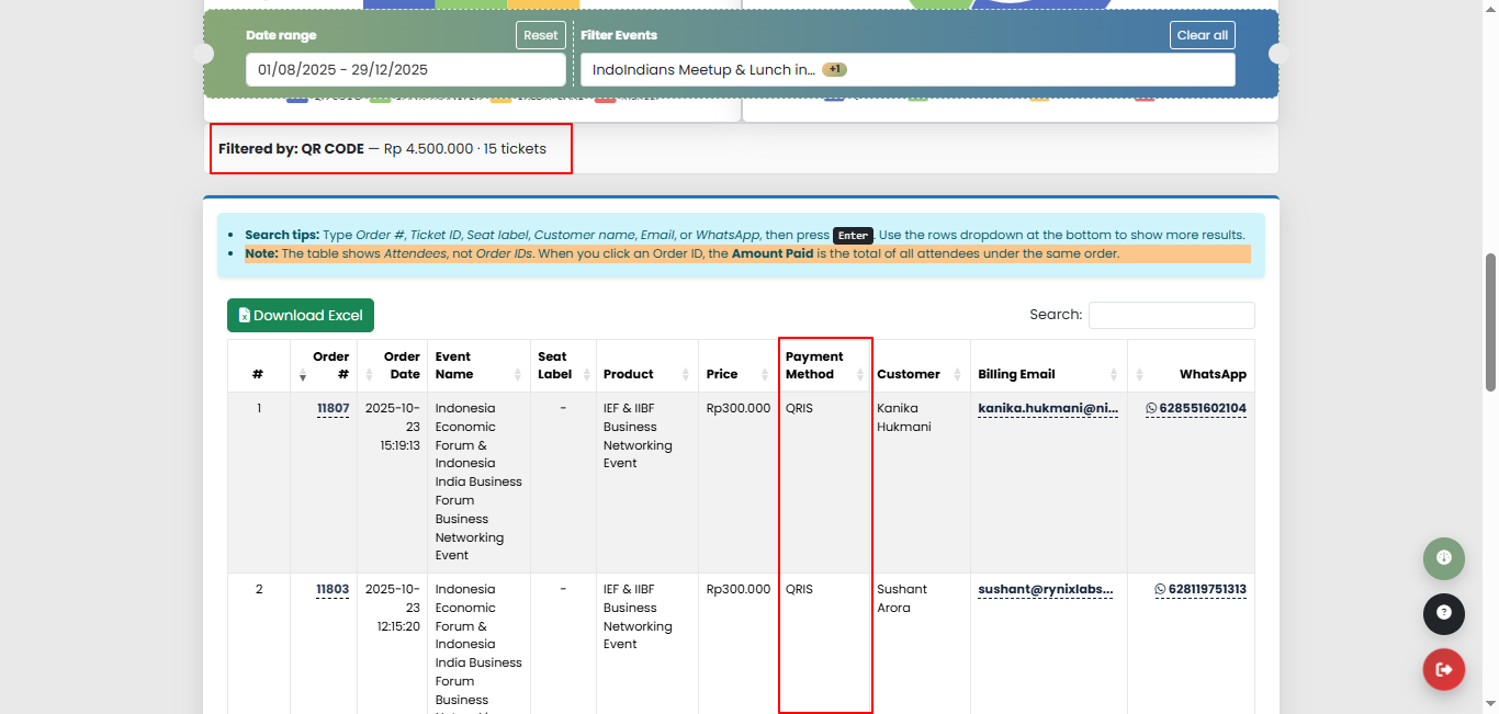 Secara otomatis table attendee akan ter-filter sesuai dengan metode pembayaran yang dipilih seperti gambar di bawah.