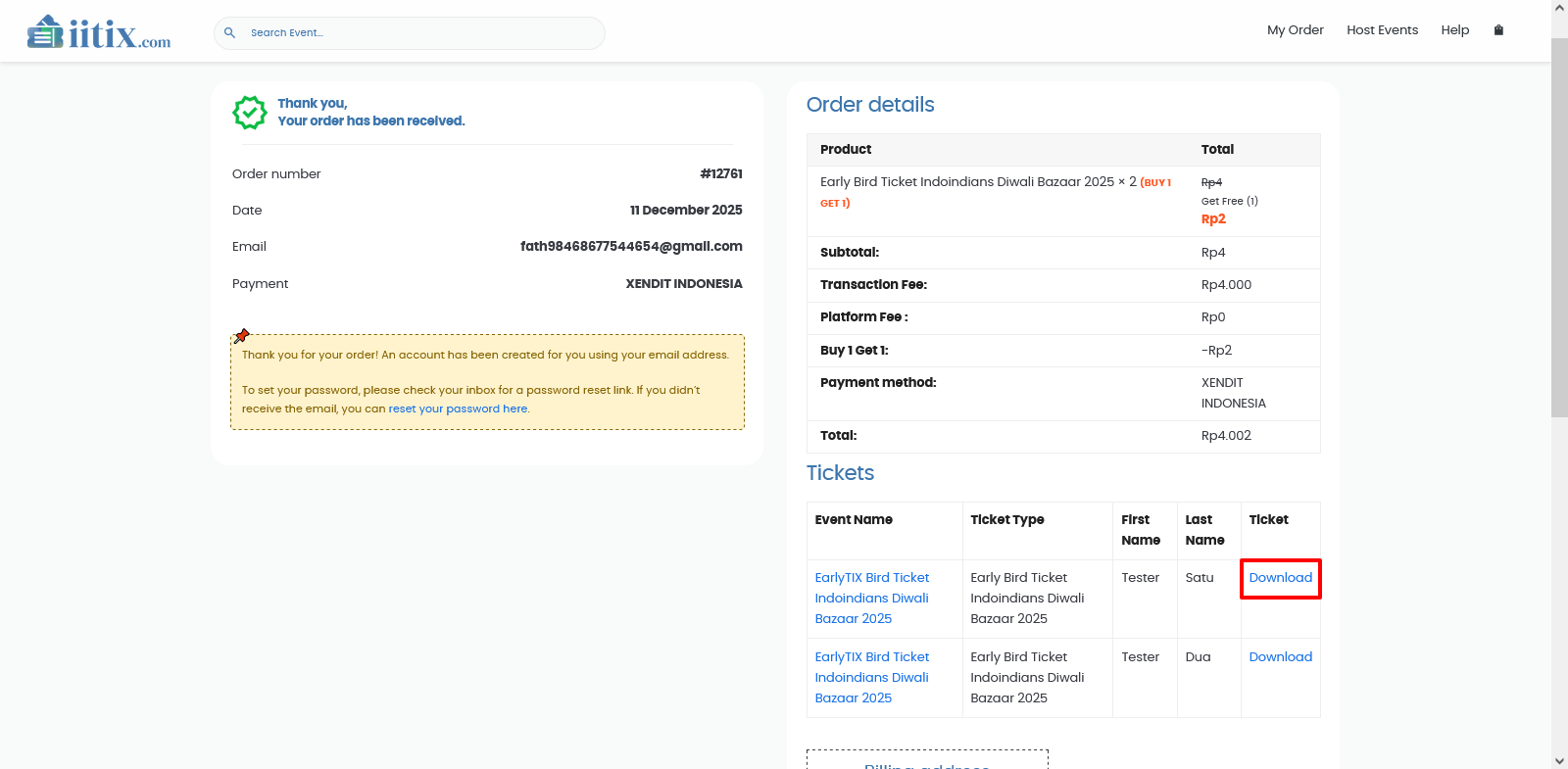9. On the order details page, download your ticket using the “Download” link in the ticket table.