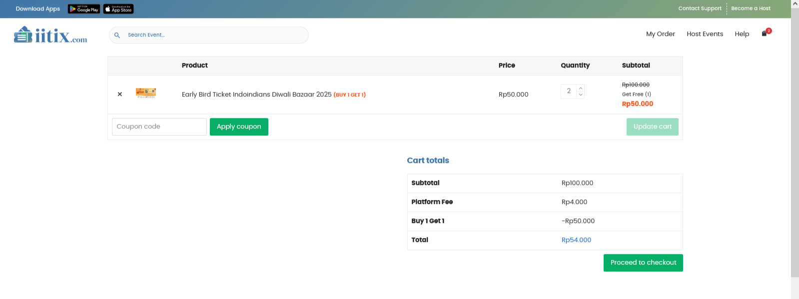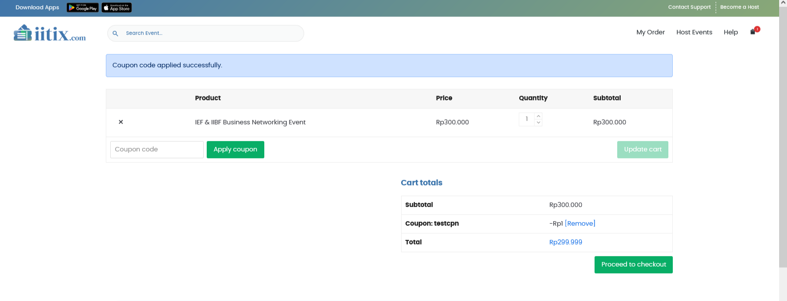 - You can enter a coupon code (if any), and the system will verify it and apply price changes if your coupon is valid.