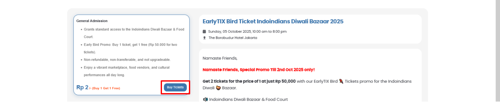 2. Click “Buy Tickets” on the selected event to open the ticket details page.